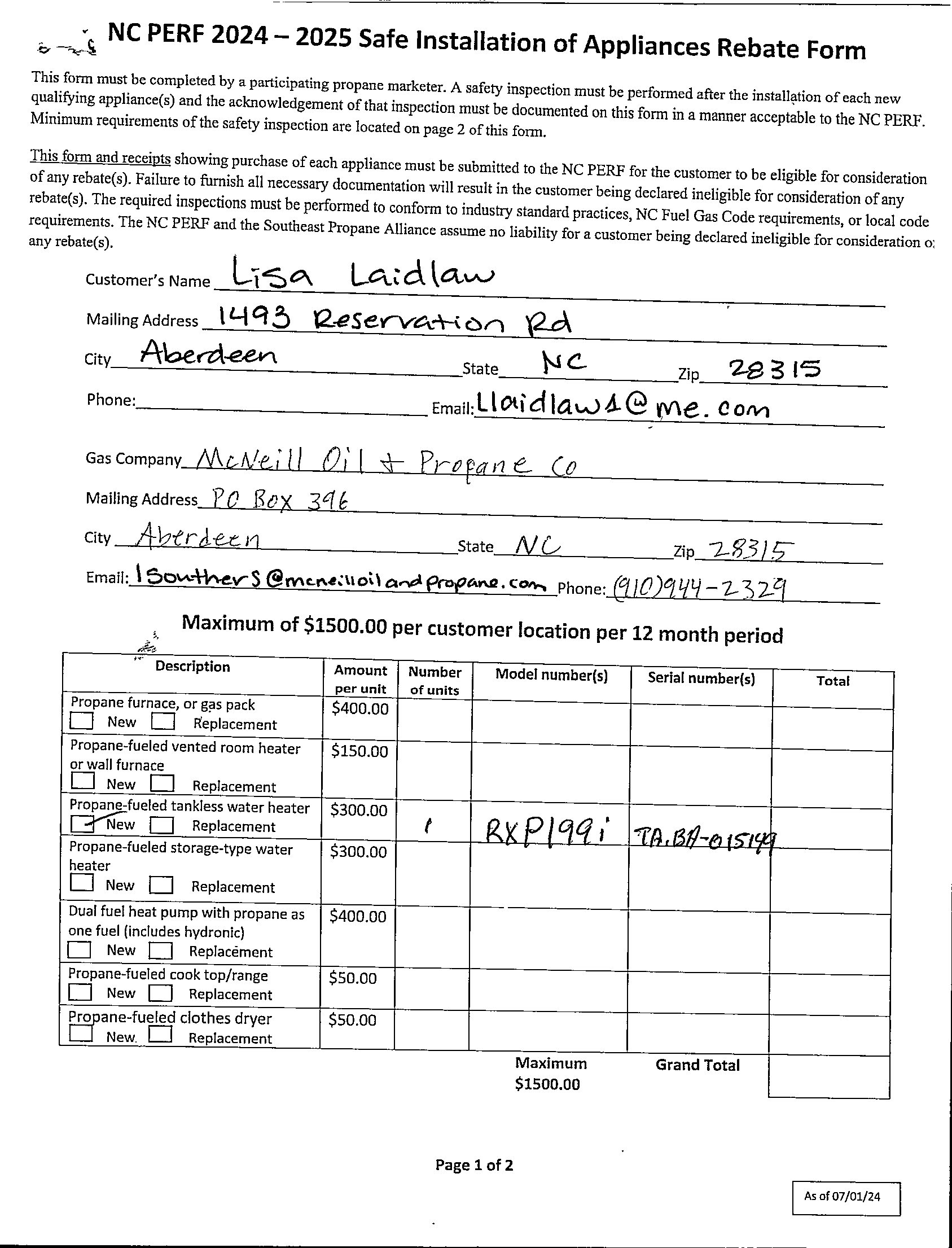 | 2025-19263507 | LISA LAIDLAW | Email hidden; Javascript is required. | (630) 880-5050 | 1493 RESERVATION RD ABERDEEN, North Carolina 28315 Map It | 1493 RESERVATION RD ABERDEEN, North Carolina 28315 Map It | McNeill Oil and Propane | (910) 944-2329 | Email hidden; Javascript is required. | Payment Sent | 07/07/2025 | 05/19/2025 | Replacement or New Appliance | 1 | $300.00 | New Installation | Tankless Water Heater ($300.00) | RINNAI | RXP199I | TA.BA-015149 | 05/28/2025 | $300.00 | 300 | |||||||||||||||||||||||||||||||||||||||||